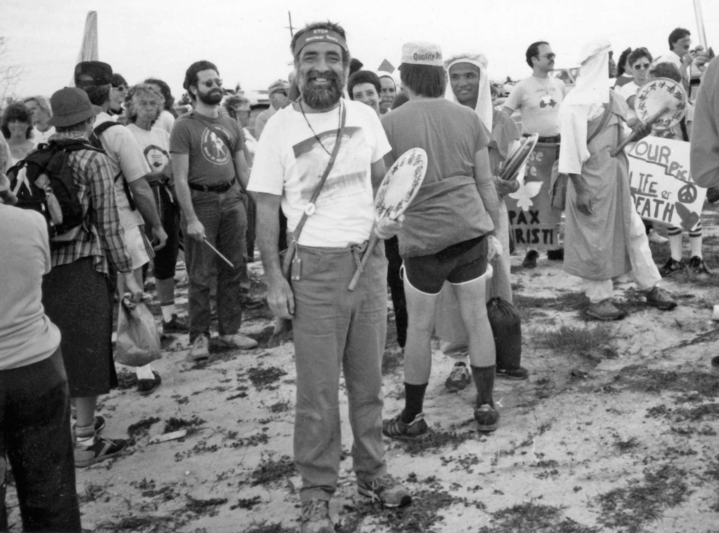 Derek with drum, Nipponzan Myohoji Buddhist monks and marchers embarking on protest walk to Trident Missile Site in Florida, 1987 Nov 3, 2016